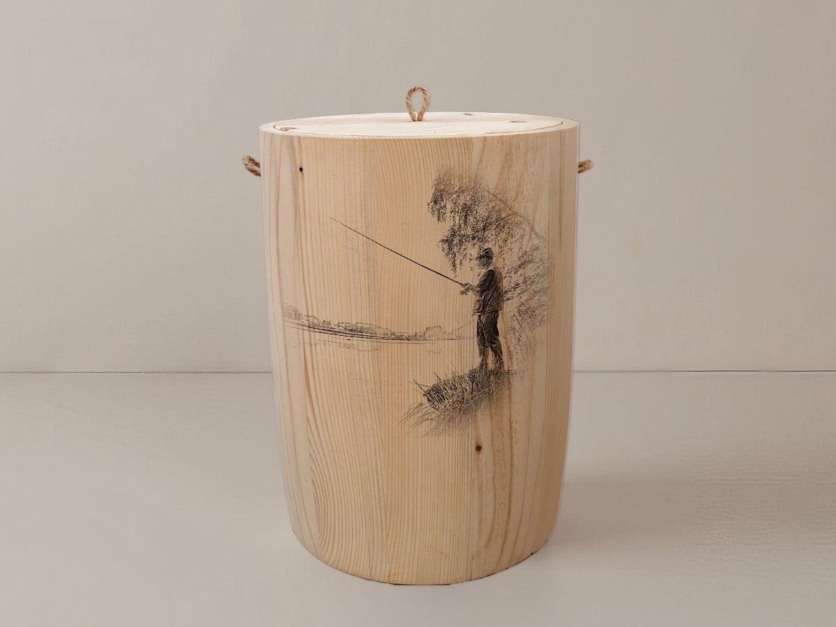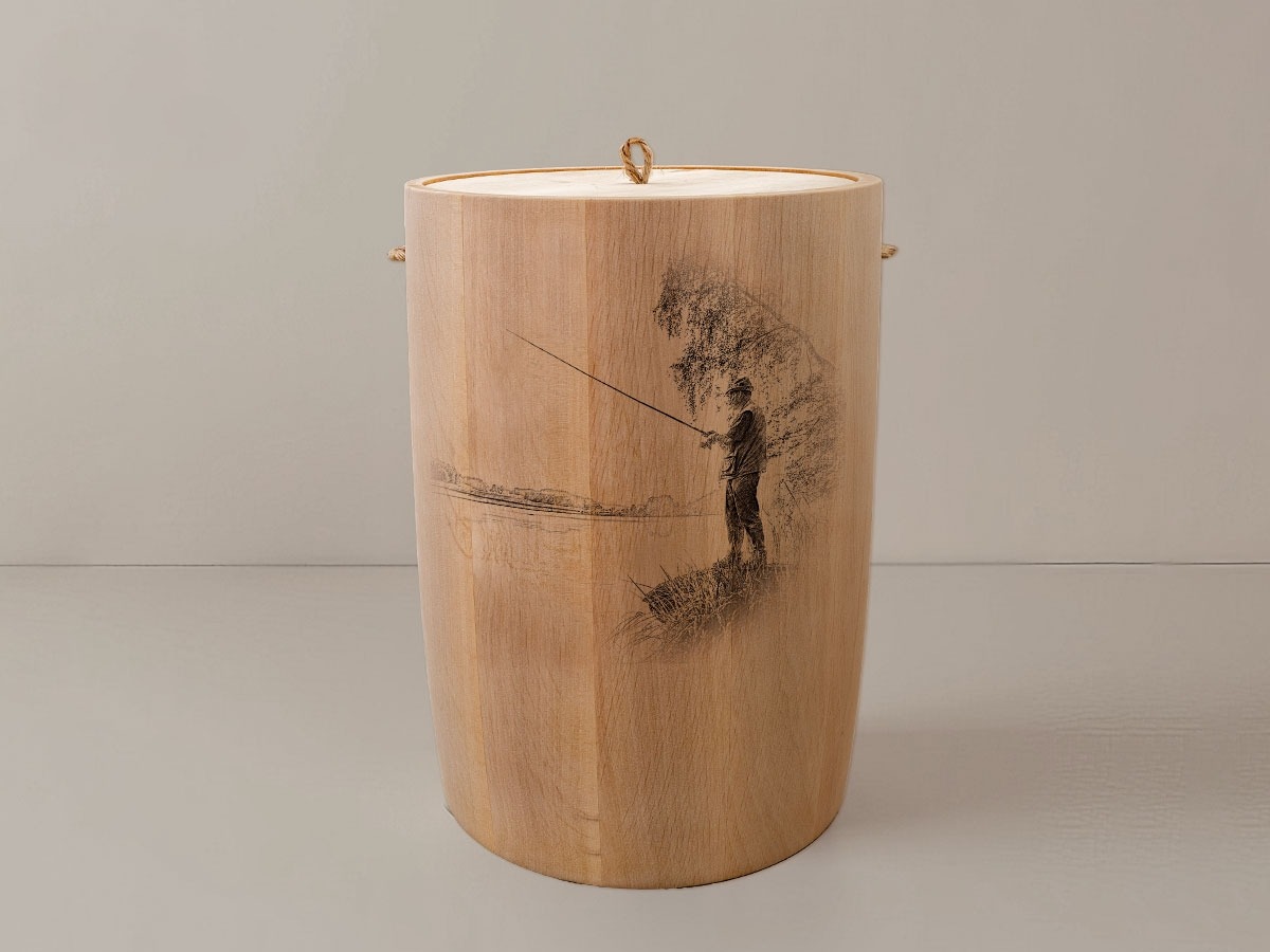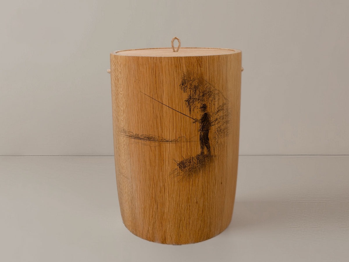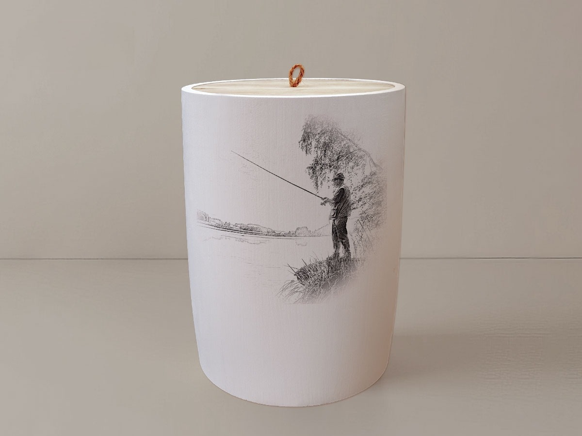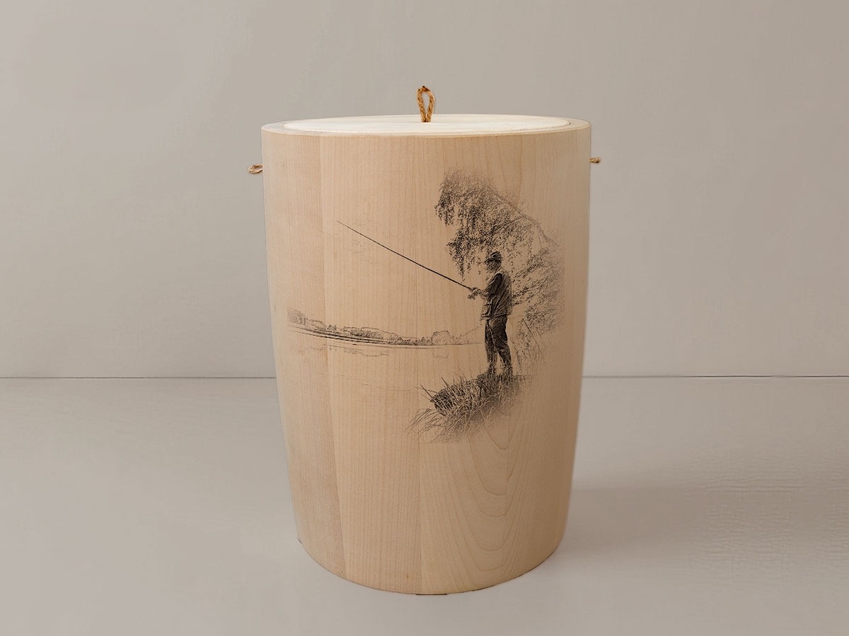 Die Angler-Urne erweckt die Sehnsucht nach endlosen Gewässern und der stillen Freude am Fischen. Das filigrane Motiv zeigt eine harmonische Szene von Anglern, die in der Morgendämmerung ihre Ruten auswerfen – ein Bild, das Erinnerungen an entspannte Stunden am Wasser weckt. Die präzise Lasergravur fügt sich sanft in das natürliche Holzbild ein und bewahrt die einzigartigen Maserungen jedes Stückes, während sie den Charakter der Urne auf eindrucksvolle Weise unterstreicht.